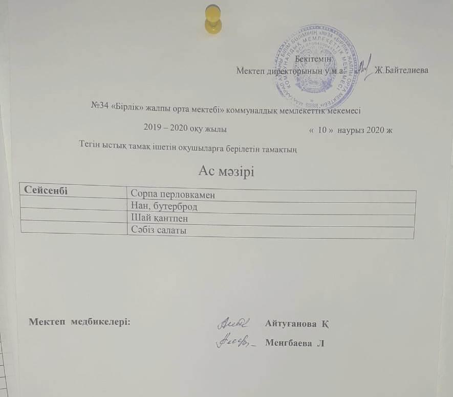Тегін ыстық тамақпен оқушыларды қамту » "№34 Бірлік ЖББМ" КММ